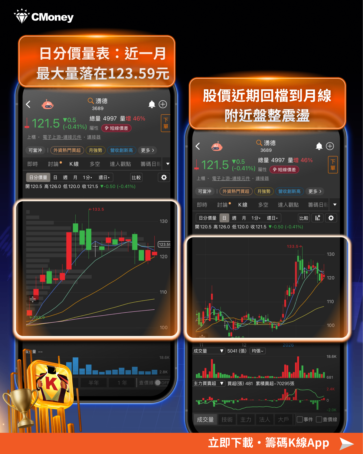 打開《籌碼 K 線》觀察技術面,我們看到日分價量,選擇近一月可以看到最大量落在123.59元,這代表著近一個月以來,多數投資人的成本價落在此位階。因此目前股價為121.5元,股價<分價量表。這也代表著日分價量表成為了短線上湧德(3689)的壓力。後續觀察是否能夠一舉站上,將壓力轉為支撐位階。