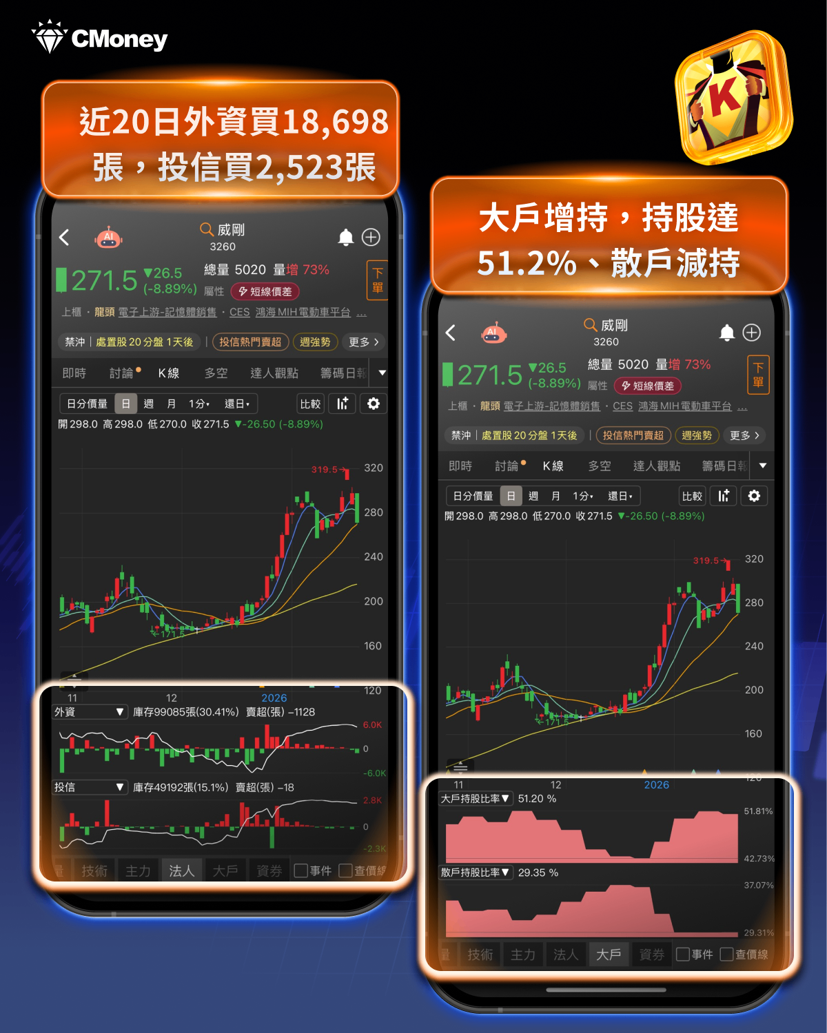 打開《籌碼 K 線》看到籌碼面,我們點選下方「法人」,就可以看到法人動向,近 20 日外資買超 18,698 張、投信買 2,523 張。再點選下方的「大戶」,就可看到大戶與散戶持股方向,可以看到大戶持股比率近期增加,持股高達 51.2%,散戶持股比率減少,代表著法人與大戶近期積極進場佈局威剛(3260),看好後勢表現。