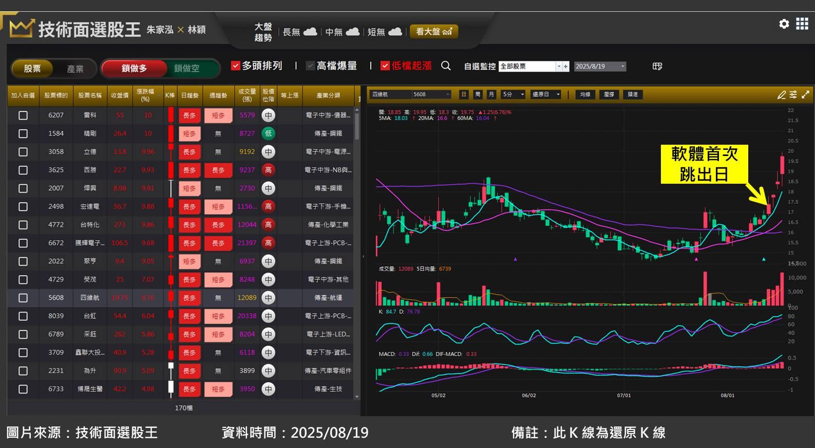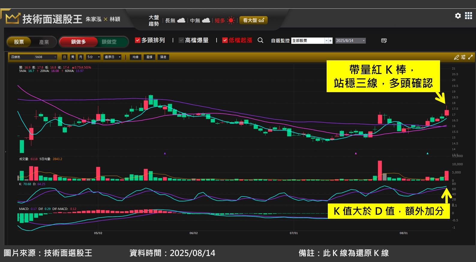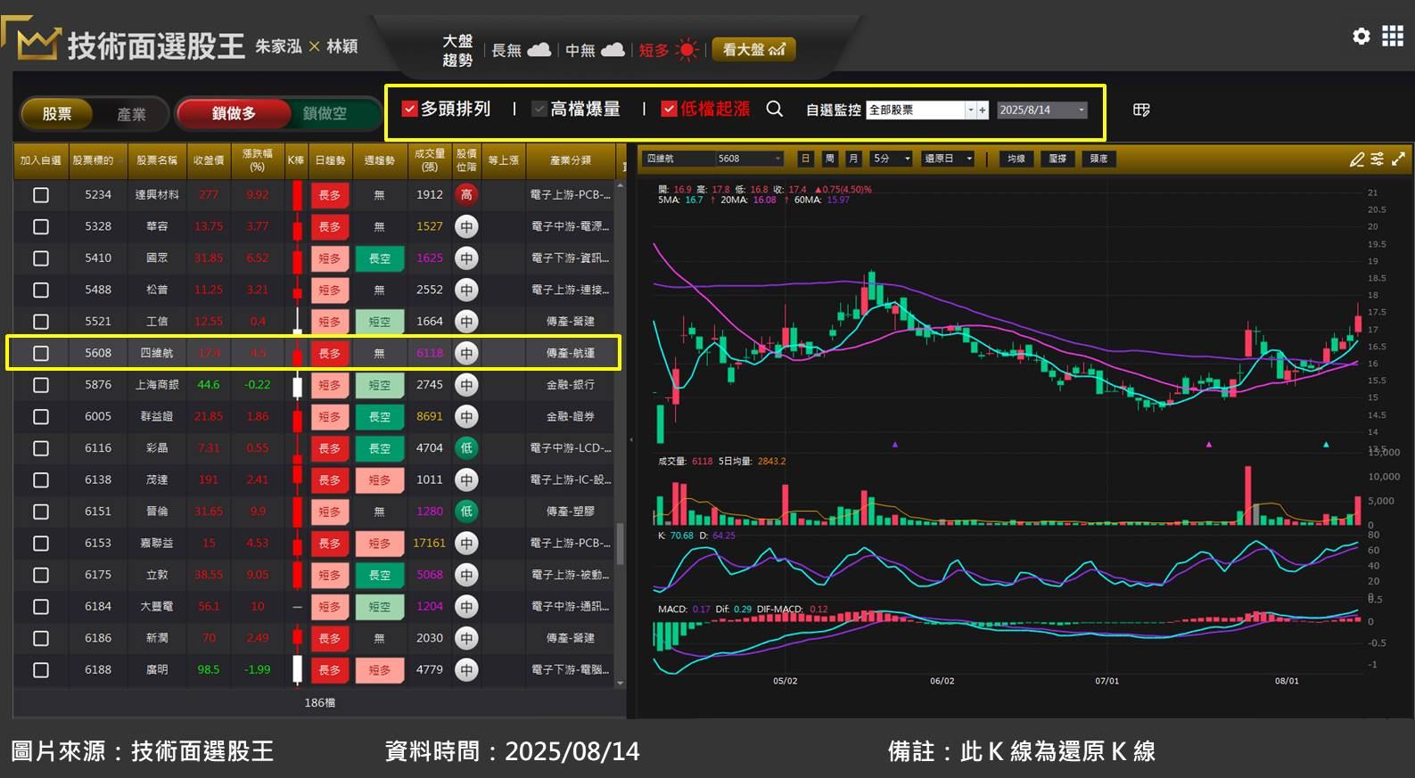 讓我們用「技術面選股王」將時間撥回 2025/08/14,並且查看「鎖做多」股票。可以看到當時四維航(5608)同時出現在「多頭排列」、「低檔起漲」多方策略中,接著讓老師告訴你做多理由。(備註:圖中 K 線圖是還原圖)