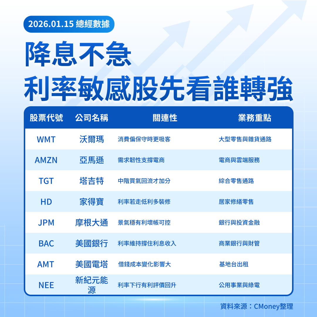 當市場從「快要降」改成「可能要等」,最有感的是那些很吃借錢成本、或市場定價很看利率的公司:像公用事業、新型基礎建設出租、以及大型不動產出租類股;同時,消費數據偏強又會讓大型零售更有底氣,例如沃爾瑪(WMT)、亞馬遜(AMZN)這種能靠規模撐住成本的公司。