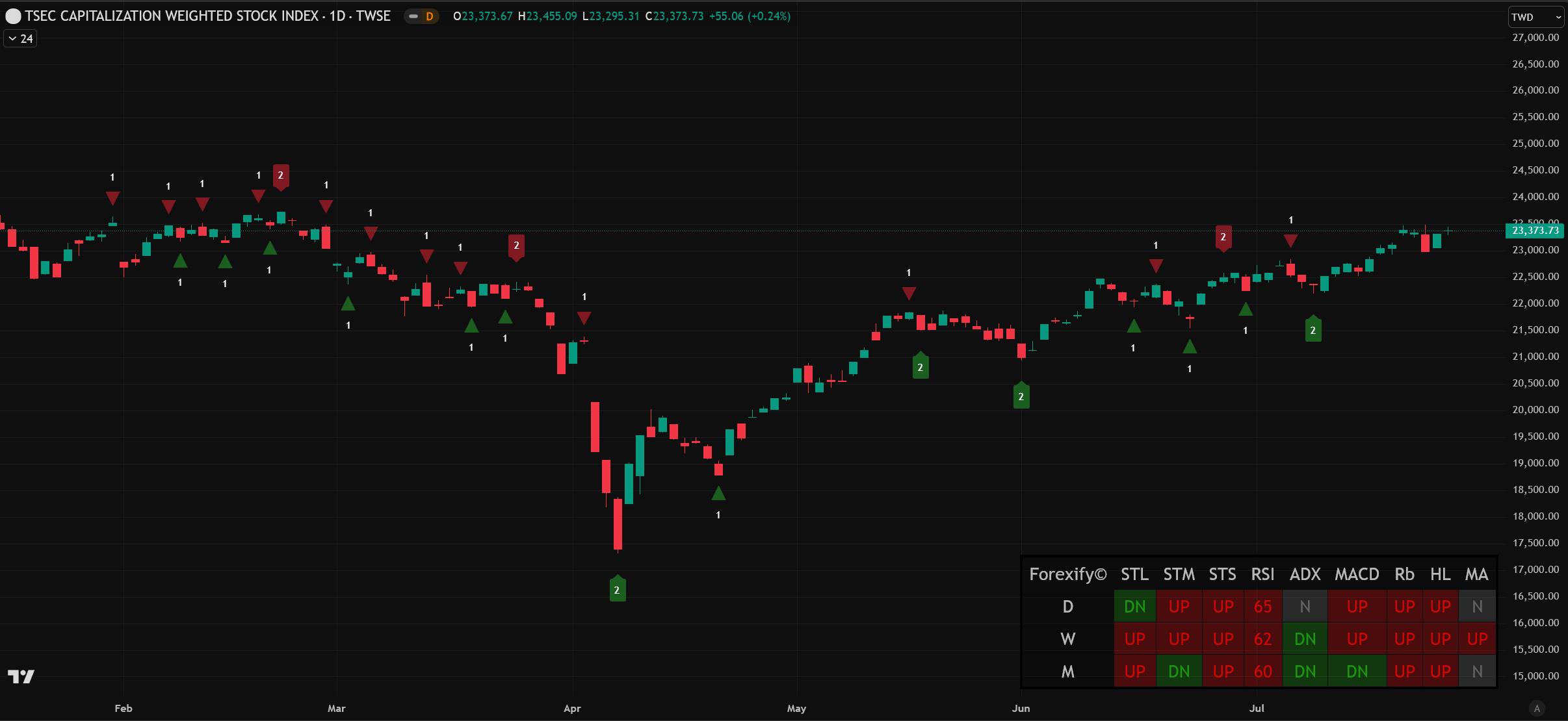 台股今日呈現開高震盪格局,加權指數終場上漲55.06點,漲幅0.24%,收在23,373.73點,成交量達3,407.21億元。櫃買指數同步走揚,上漲0.77點,漲幅0.33%。盤中指數一度突破23,400點關卡,最高上漲逾百點,但受市場觀望氣氛影響,漲幅收斂。