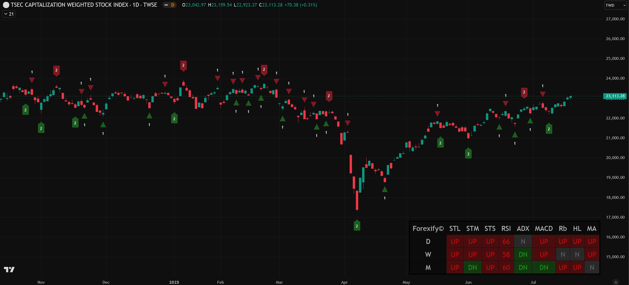 台股今日呈現開高震盪格局,加權指數終場上漲70.38點(+0.31%),收在23,113.28點,成交金額3,290億元。櫃買指數同步走揚,上漲2.80點(+1.20%),顯示中小型股表現相對活躍。盤勢主要受台積電(2330)尾盤回穩及台塑四寶強勢表態帶動,成功扭轉早盤震盪走勢。