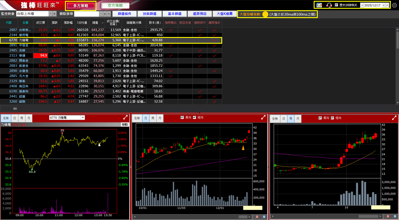 從 2025/12/17 的「多方策略」強勢股清單中,可以看到力積電(6770)出現在成交總量的第 3 名,當日總成交量為 156,274 張,若數值呈現粉色代表總量大於 5 日均量。