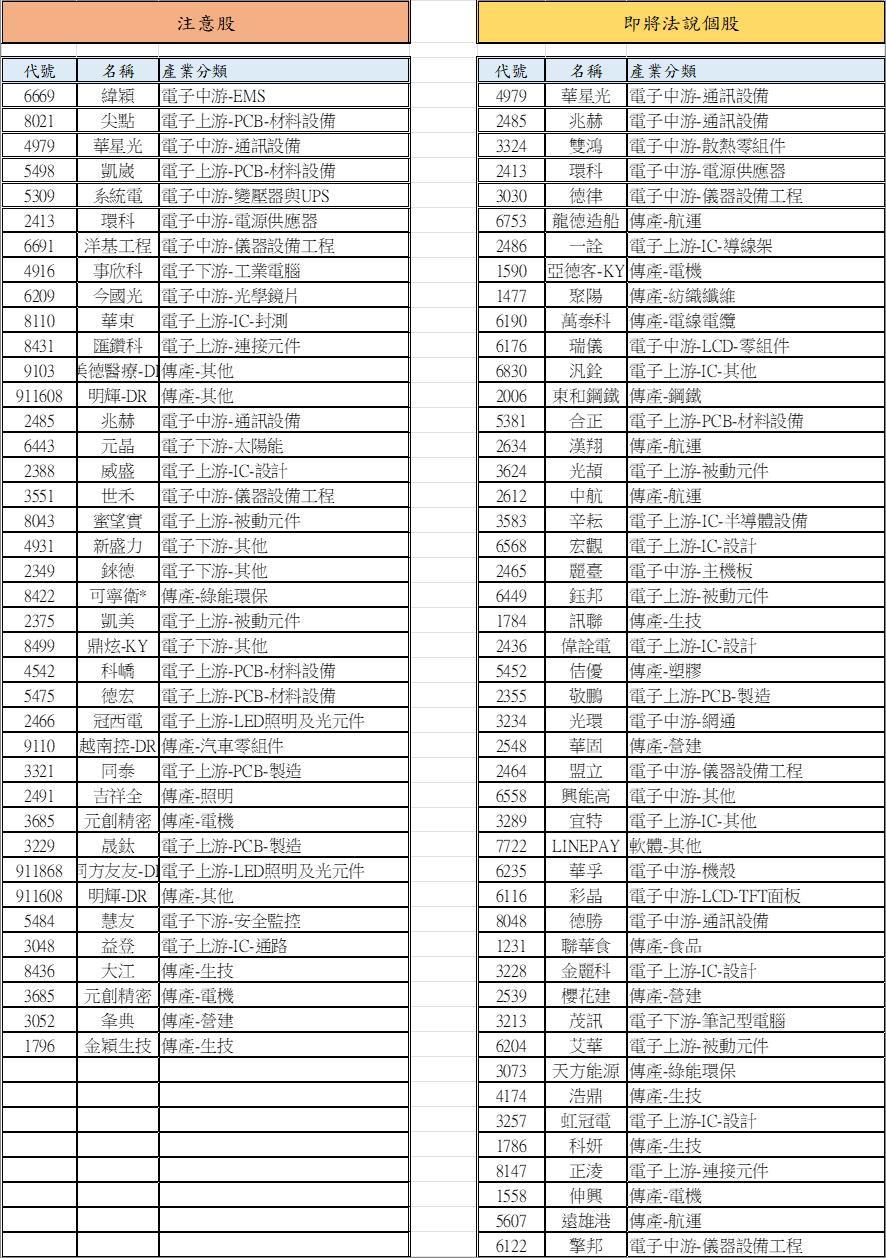 | 6944 | 兆聯實業 | 3.67 | 11.2 | 傳產-綠能環保 | 5309 | 系統電 | -2.16 | 8.1 | 電子中游-變壓器與UPS | 3711 | 日月光投控 | -2.14 | -4.6 | 電子上游-IC-封測 | 8021 | 尖點 | -5.09 | 14.9 | 電子上游-PCB-材料設備 | 6139 | 亞翔 | 1.19 | 21.5 | 電子中游-儀器設備工程 | |||||||