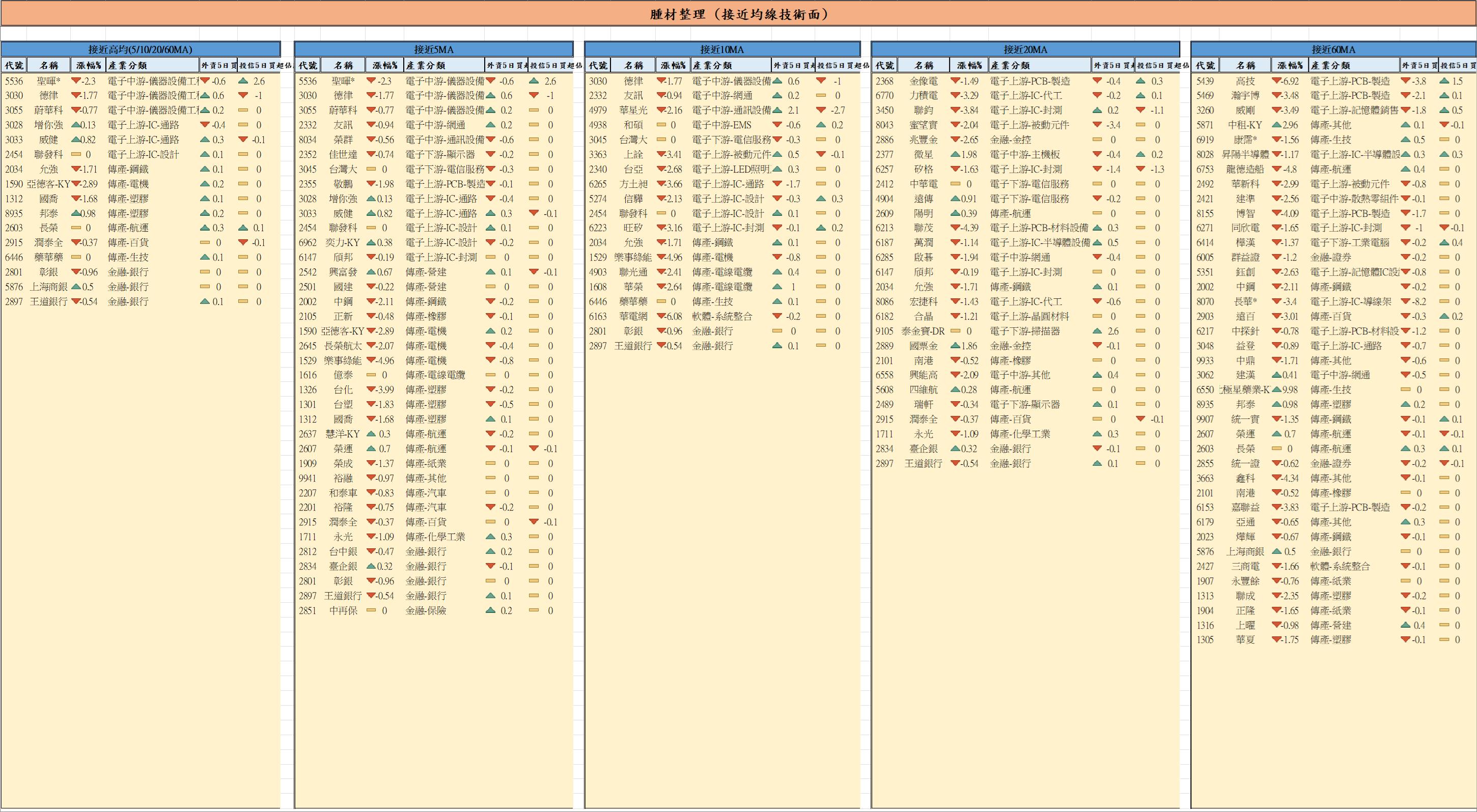 | 代號 | 名稱 | 漲幅% | 5日漲幅(%) | 產業分類 | 代號 | 名稱 | 漲幅% | 5日漲幅(%) | 產業分類 | 代號 | 名稱 | 漲幅% | 5日漲幅(%) | 產業分類 | 代號 | 名稱 | 漲幅% | 5日漲幅(%) | 產業分類 | 代號 | 名稱 | 漲幅% | 5日漲幅(%) | 產業分類 | |||||||