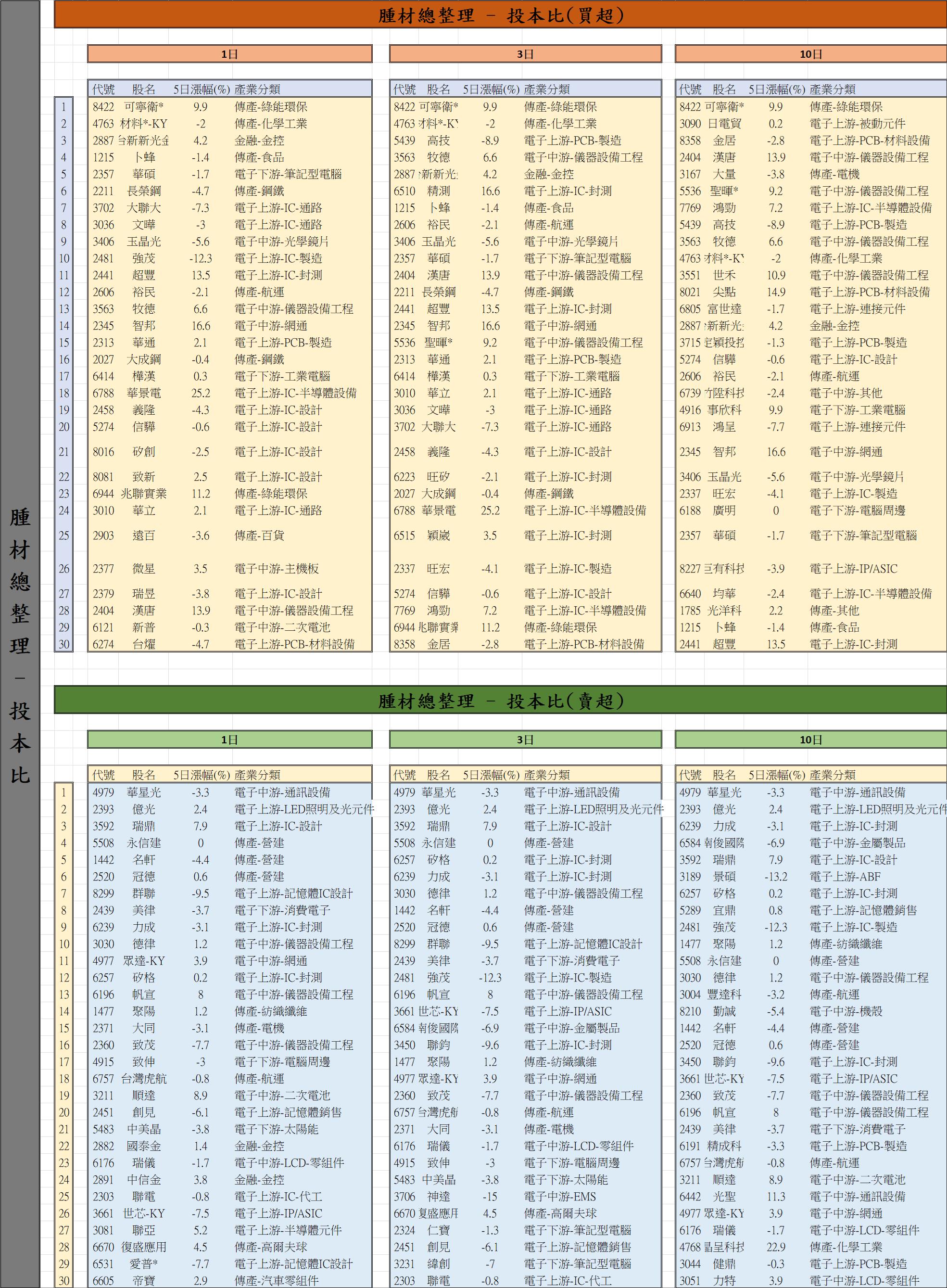 | 5522 | 遠雄 | 3.65 | 8.8 | 傳產-營建 | 2467 | 志聖 | -1.63 | 7.3 | 電子上游-PCB-材料設備 | 6944 | 兆聯實業 | 3.67 | 11.2 | 傳產-綠能環保 | 2337 | 旺宏 | -2.11 | -4.1 | 電子上游-IC-製造 | 8039 | 台虹 | -2.85 | 1.6 | 電子上游-PCB-製造 | |||||||