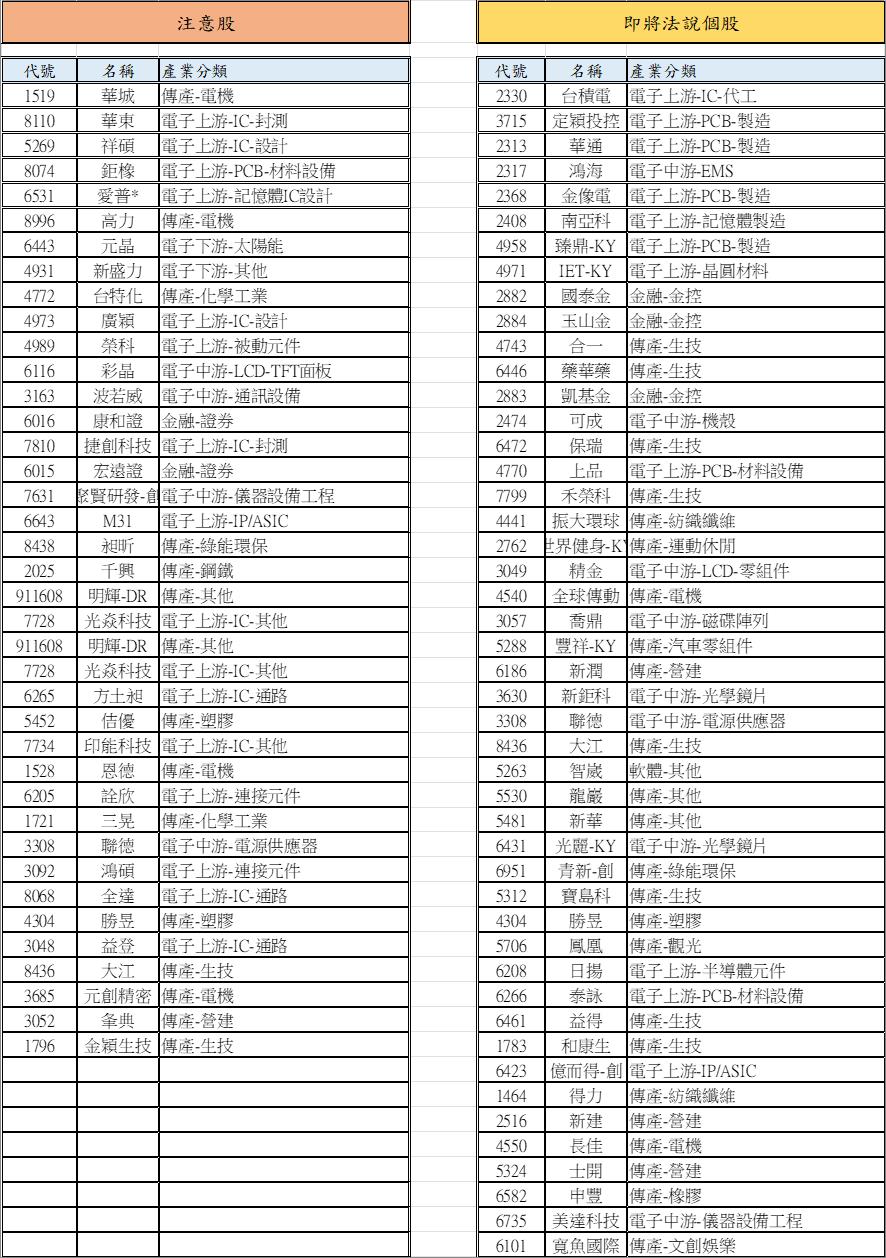 | 1519 | 華城 | 3.94 | 10.8 | 傳產-電機 | 6442 | 光聖 | 1.07 | 6.8 | 電子中游-通訊設備 | 2327 | 國巨* | 2.48 | 1.4 | 電子上游-被動元件 | 2327 | 國巨* | 2.48 | 1.4 | 電子上游-被動元件 | 2344 | 華邦電 | 4.29 | 6.8 | 電子上游-IC-製造 | |||||||