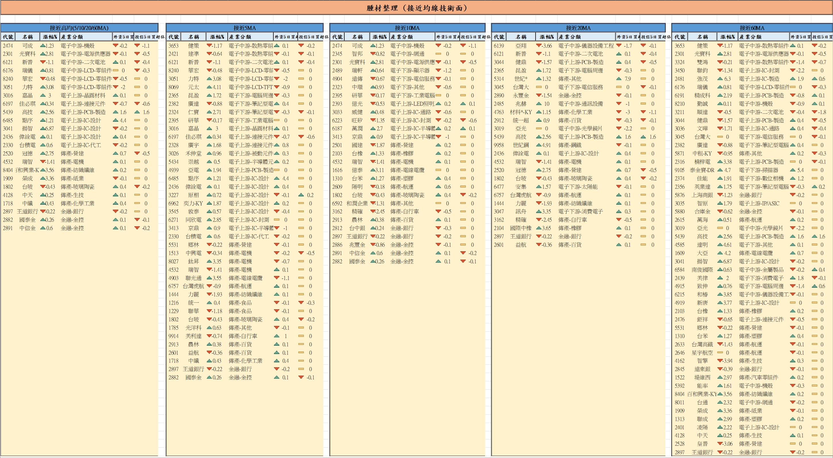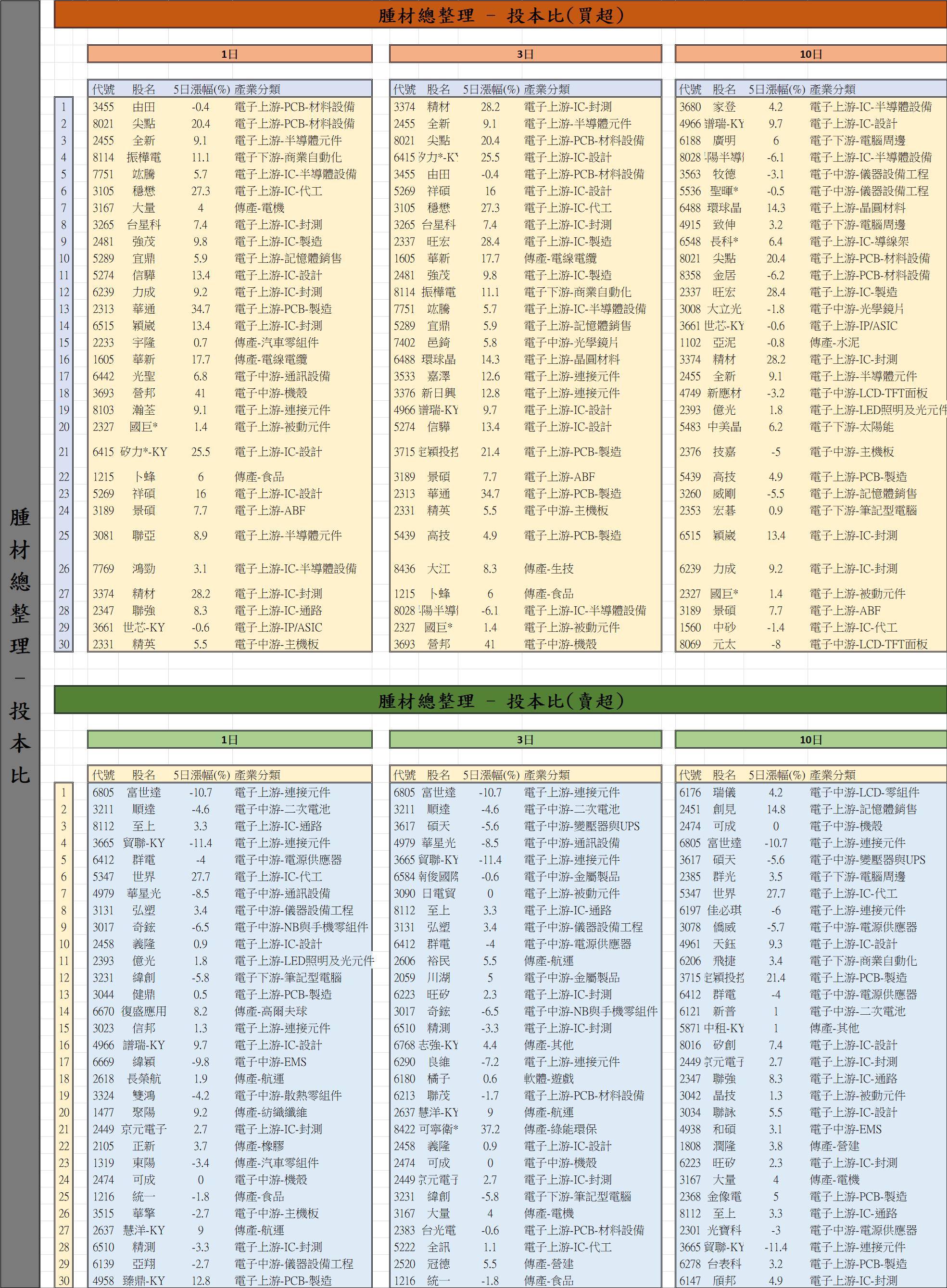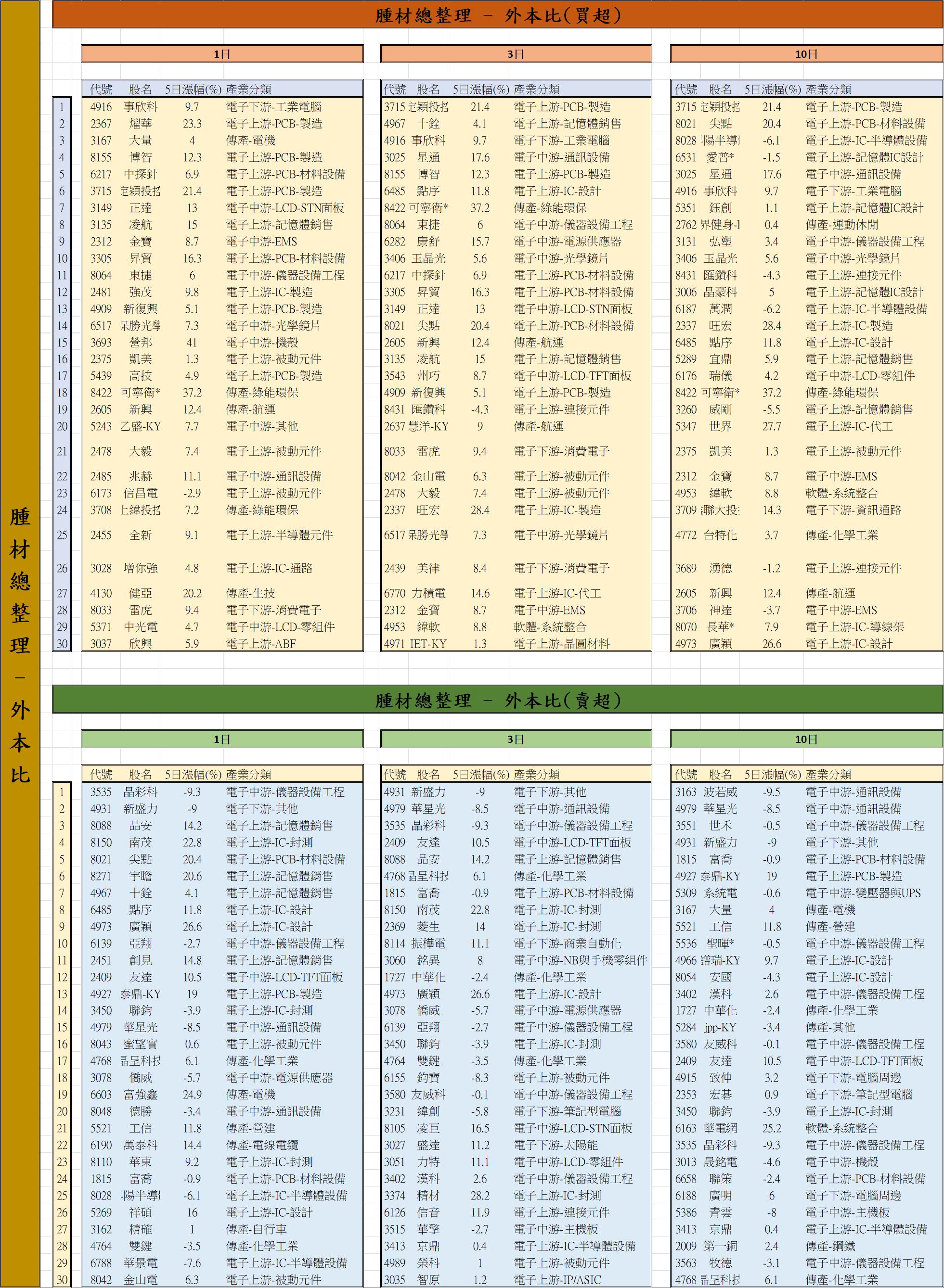 | 3231 | 緯創 | -2.01 | -5.8 | 電子下游-筆記型電腦 | 2454 | 聯發科 | 1.76 | -5.3 | 電子上游-IC-設計 | 3231 | 緯創 | -2.01 | -5.8 | 電子下游-筆記型電腦 | 2368 | 金像電 | 4.55 | 5 | 電子上游-PCB-製造 | 2383 | 台光電 | 2.88 | -0.6 | 電子上游-PCB-材料設備 | |||||||
