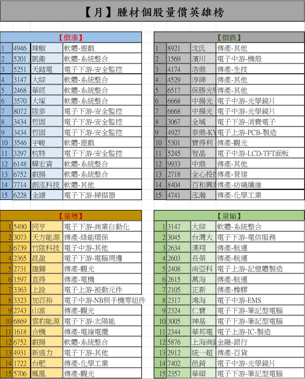 - 【月】腫材個股量價英雄榜(量價理論選股)
