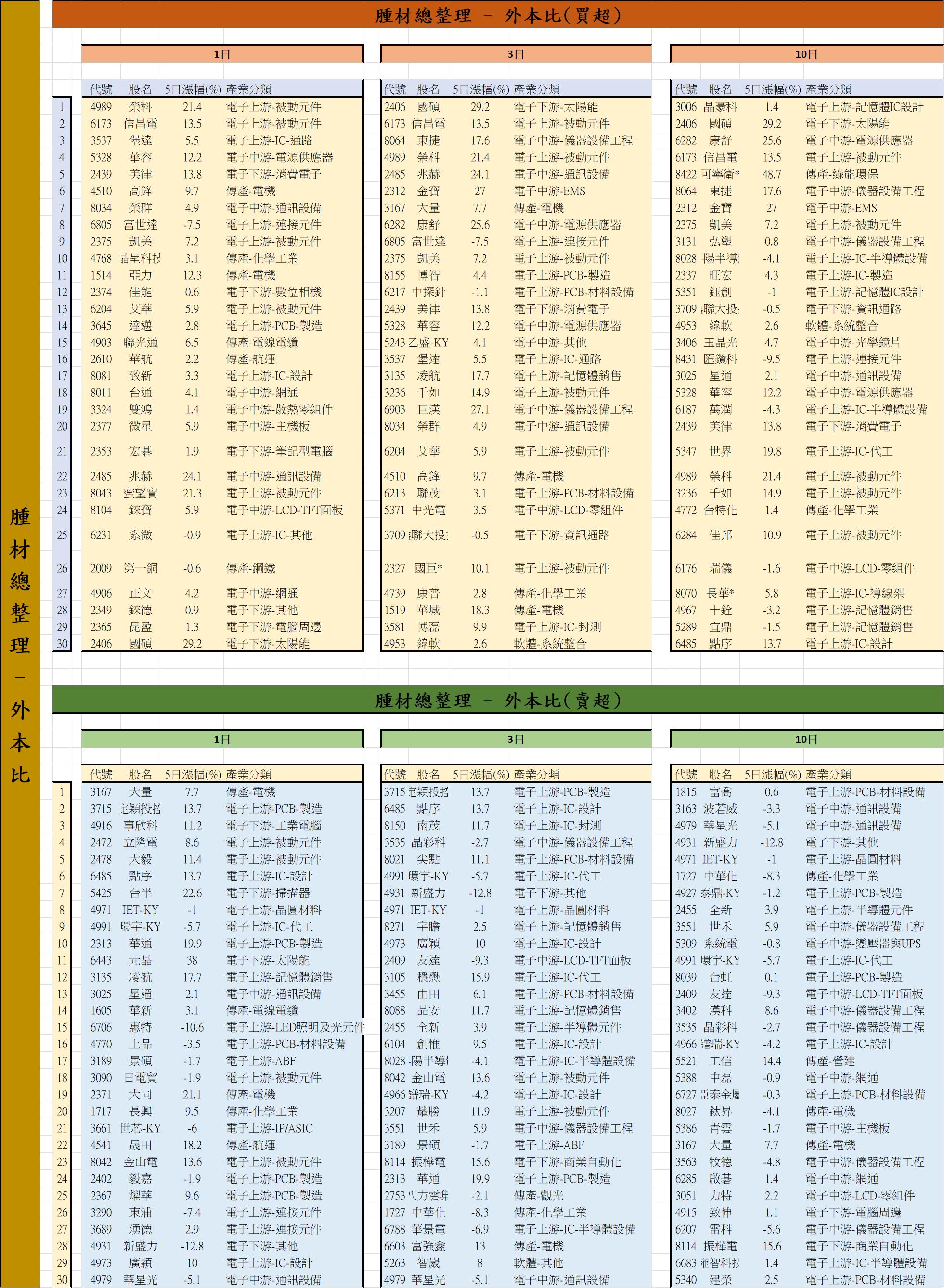 | 6488 | 環球晶 | 8.4 | 9.8 | 電子上游-晶圓材料 | 8996 | 高力 | -1.32 | 31.3 | 傳產-電機 | 3037 | 欣興 | -1.57 | 10.6 | 電子上游-ABF | 1717 | 長興 | 2.52 | 9.5 | 傳產-化學工業 | 2492 | 華新科 | 2.67 | 1.9 | 電子上游-被動元件 | |||||||