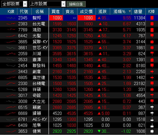 千金股漲多跌少,僅散熱健策(3653)終場收跌1.02%,UPS不斷電大廠旭隼(6409)、BBU AES-KY(6781)雙雙收平,網通智邦(2345)強攻漲停,CCL台光電(2383)、IC測試分類機與ATC鴻勁(7769)、CPO光聖(6442)、連接線束貿聯-KY(3665)、伺服器導軌大廠川湖(2059)、連接器嘉澤(3533)、軸承富世達(6805)、高速傳輸祥碩(5269)、散熱奇鋐(3017)、光學鏡頭大立光(3008)、測試介面解決方案穎崴(6515)皆收漲,
