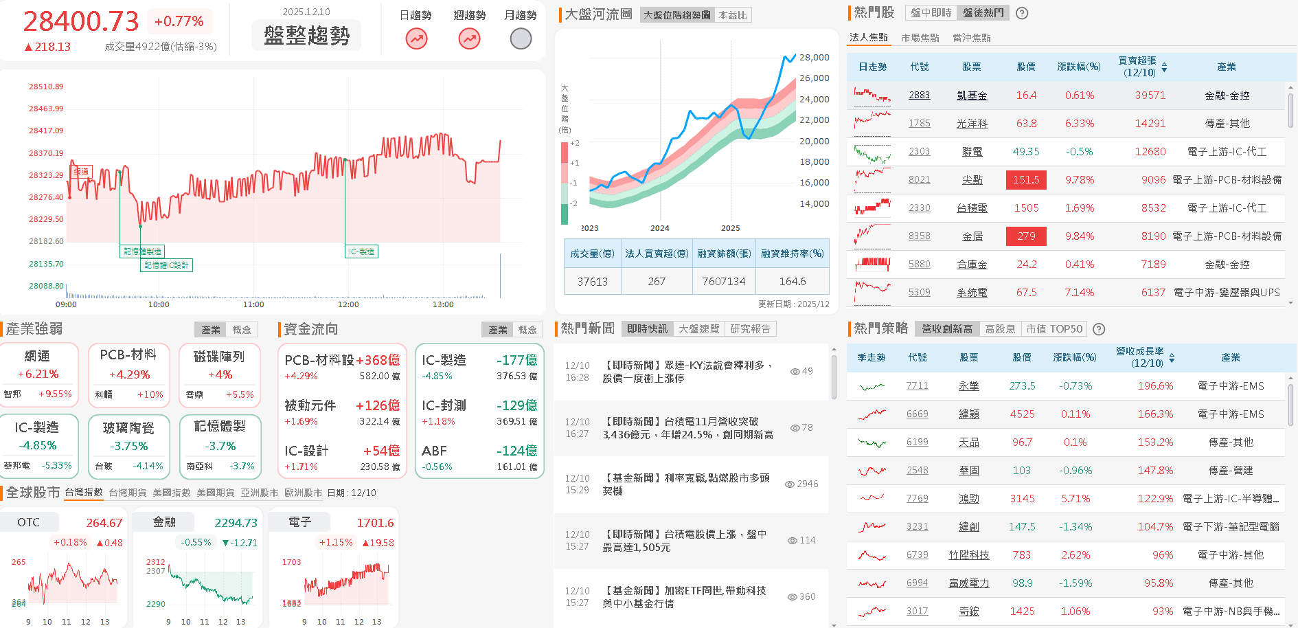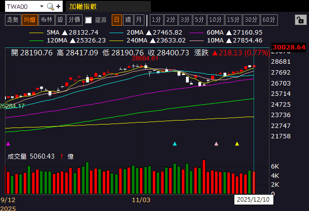 亞股部分,日經今(10)日收跌,續於月線上整理,韓股今(10)日震盪收跌,延續築底後墊高格局;加權早盤電、金、傳三方開高後,電子震盪墊高,金、傳熄火翻黑,今(10)日加權整體仍維持向上墊高格局,對比11/04前高的28,554.61點,僅差153.88點,