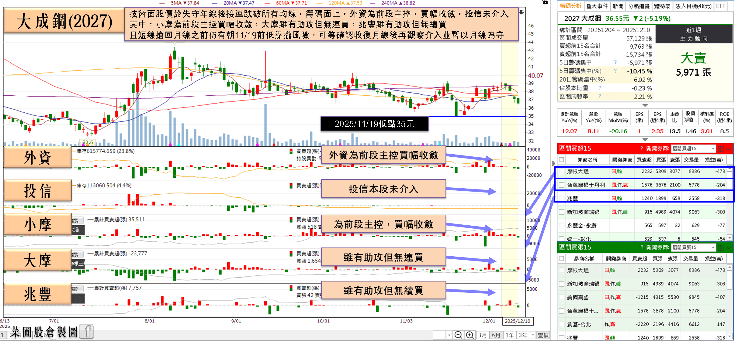 (大成鋼籌碼表現 資料來源:籌碼K線 菜圃股倉製圖)(註 : 以上僅為數據揭露,無推介買賣之意,投資人須自負交易風險)
