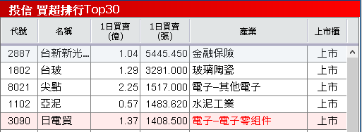 買超前五:台新新光金(2887)、台玻(1802)、尖點(8021)、亞泥(1102)、日電貿(3090)