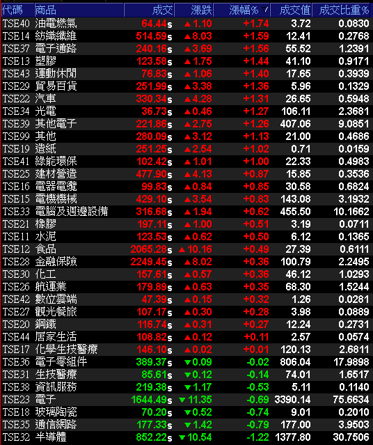 矽晶圓、PCB、記憶體、製鞋、被動、MOSFET、BBU仍有指標參與輪動,加權指數終場收跌103.50點,以27,648.91點作收,成交量4,614.28億。3大類股指數僅電子終場收跌0.69%,33大類股指數漲多跌少,油電燃氣、紡織纖維2大類股指數終場分別收漲1.74%、1.59%,表現較佳,半導體、通信網路2大類股指數終場分別收跌1.22%、0.79%,表現較弱。
