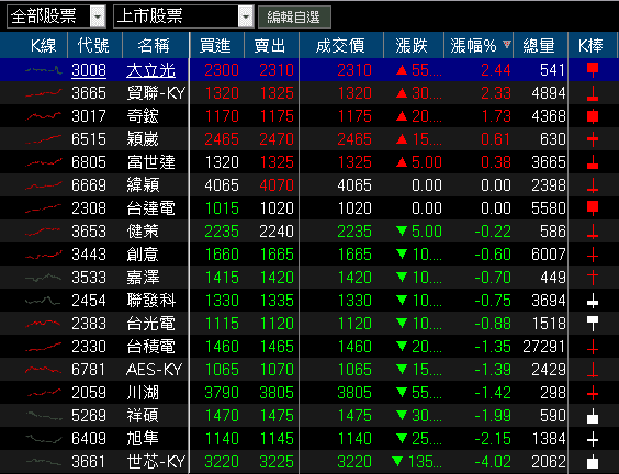 千金股跌多漲少,光學鏡頭大立光(3008)、連接線束貿聯-KY(3665)、散熱奇鋐(3017)、測試介面解決方案穎崴(6515)、軸承富世達(6805)皆收漲,電源管理與散熱解決方案台達電(2308)震盪收平,散熱健策(3653)、連接器嘉澤(3533)、CCL台光電(2383)、BBU AES-KY(6781)、伺服器導軌大廠川湖(2059)、高速傳輸祥碩(5269)、UPS不斷電大廠旭隼(6409)皆收跌,