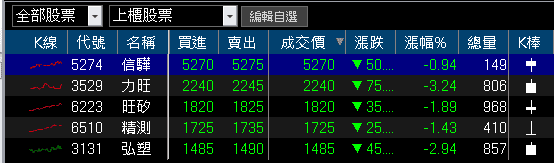 OTC櫃買指數中,千金股一致走跌,信驊(5274)、力旺(3529)、旺矽(6223)、精測(6510)、弘塑(3131)終場跌幅分別為0.94%、3.24%、1.89%、1.43%、2.94%,
