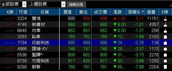 高價股跌多漲少,設備廠印能科技(7734)、散熱雙鴻(3324)、特化新應材(4749)、感測監控系統竹陞科技(6739)、工程服務商聖暉*(5536)、記憶體群聯(8299)、遊戲鈊象(3293)、高速傳輸譜瑞-KY(4966)、G2C聯盟均華(6640)終場漲跌幅分別為-2.35%、+0.11%、-1.01%、-3.88%、-3.73%、-7.68%、-1.68%、-3.37%、-1.21%,OTC櫃買指數終場收跌2.21%。