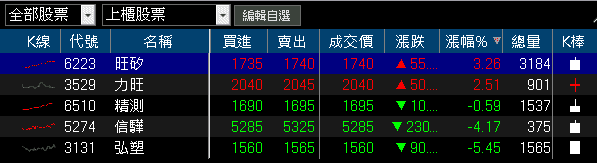 OTC櫃買指數中,千金股全數收跌,信驊(5274)、力旺(3529)、旺矽(6223)、精測(6510)、弘塑(3131)終場漲跌幅分別為-4.17%、+2.51%、+3.26%、-0.59%、-5.45%,