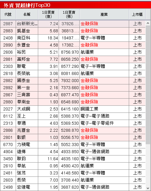 (上市外資買超前五 資料來源:籌碼K線)(註 : 以上僅為數據揭露,無推介買賣之意,投資人須自負交易風險)