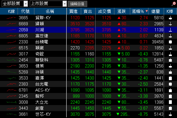千金股跌多漲少,連接線束貿聯-KY(3665)、伺服器導軌大廠川湖(2059)、軸承富世達(6805)、測試介面解決方案穎崴(6515)皆收漲,網通智邦(2345)、BBU AES-KY(6781)、散熱健策(3653)、連接器嘉澤(3533)、光學鏡頭大立光(3008)、散熱奇鋐(3017)、高速傳輸祥碩(5269)、CCL台光電(2383)皆收跌,