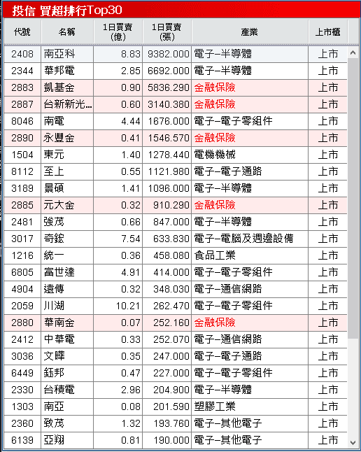 買超前五:南亞科(2408)、華邦電(2344)、凱基金(2883)、台新新光金(2887)、南電(8046)