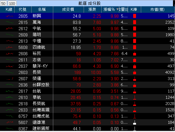 而今(14)日盤面上,因美國上週宣布,將自10/14起對中國船舶徵收港口費,中國隨即於10/10宣布報復對等舉動,於同一日起對美國船舶徵收港口費,雖不利美中雙方海運公司,但相對利於台灣、日本、南韓等海運公司,加上大盤走跌,資金浮現避險需求,航運暴起,新興(2605)、萬海(2615)、中航(2612)、陽明(2609)、中櫃(2613)、四維航(5608)皆漲停,慧洋(2637)、長榮(2603)、裕民(2606)也漲逾5%,