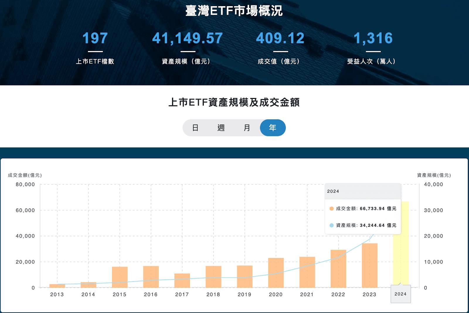 這幾年台灣投資市場最火熱的題材,絕對非ETF莫屬,大家不只定期定額也願意大額投入。從金管會E添富統計數據來看,台灣ETF檔數已經逼近200檔,總資產規模突破四兆大關,受益人數超過1,300萬人已經是全台每兩個人就有一個持有ETF。再從ETF成交總金額來看,2024年整年度高達6.67兆元,相較於2023年不到四兆出現大幅度成長,這些數據確實顯示投資熱潮持續放大。