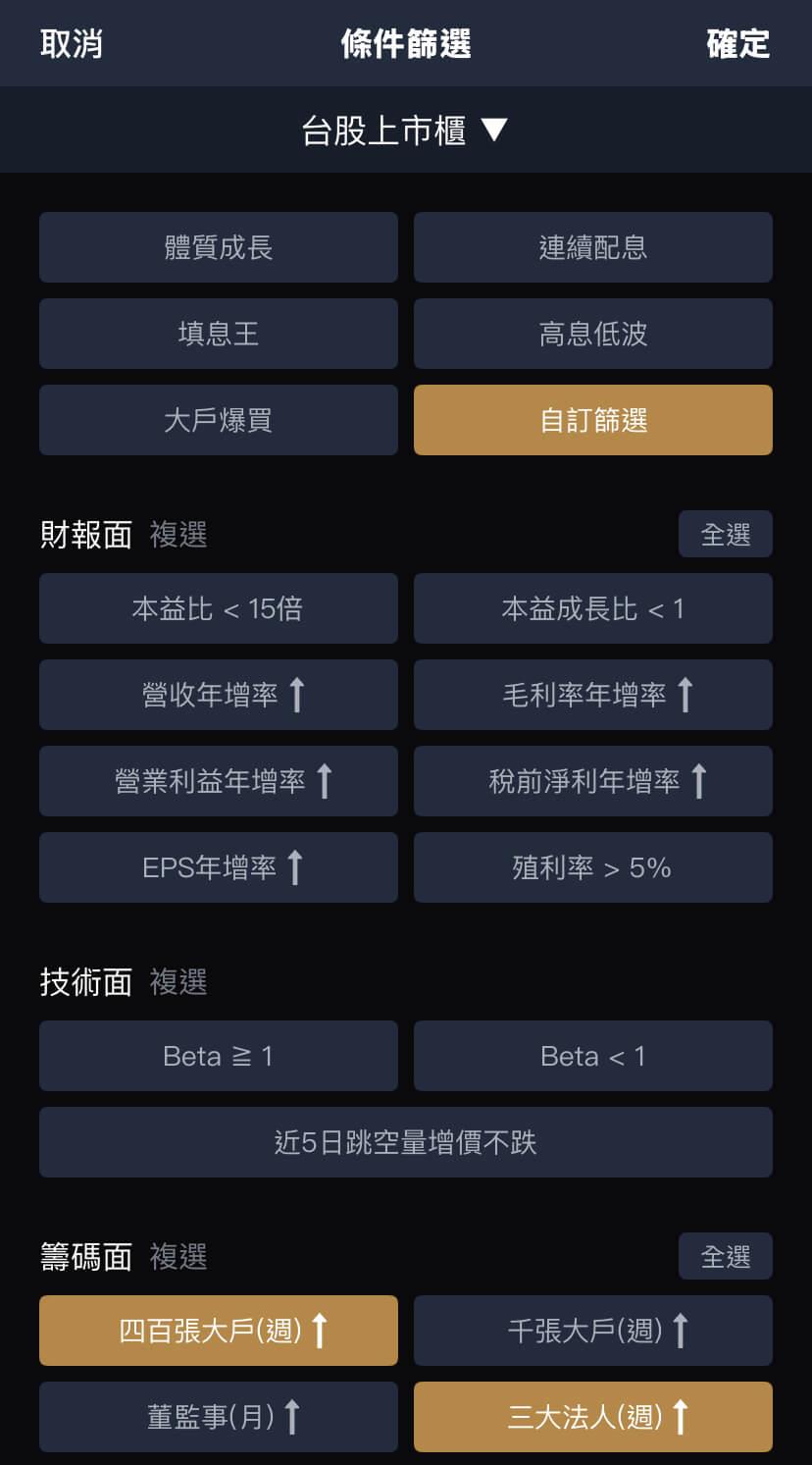 簡單來說,當我們不知道股市創高的投資方向在哪,大戶投資股市的資金規模通常動輒幾千億到兆元等級,尤其四百張大戶甚至是台股波段的風向球。我們可以直接找四百張大戶連續加碼的股票,另外三大法人最好也能持續買超,利用阿格力價值投資APP就能快速掌握市場主力的籌碼。直接打開條件篩選並點選「自訂篩選」,並在籌碼面勾選「四百張大戶↑」、「三大法人↑」,這就能找到當週受到大戶青睞的股票。